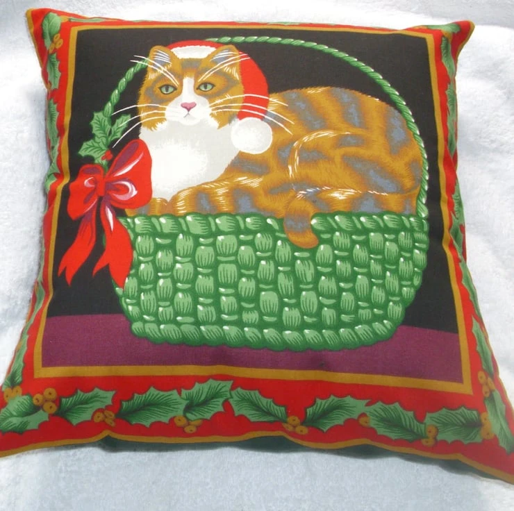 A lovely cushion of a ginger and white cat wearing his Christmas hat sitting in a green basket with a bright red bow, around the red border are green holly leaves .