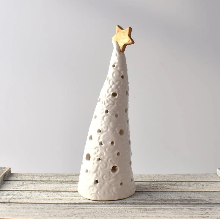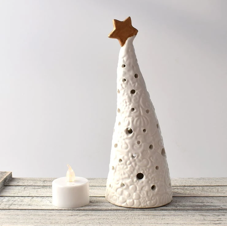 A cone shaped pottery Christmas tree with LED tea light included, standing around 18.5cm tall.