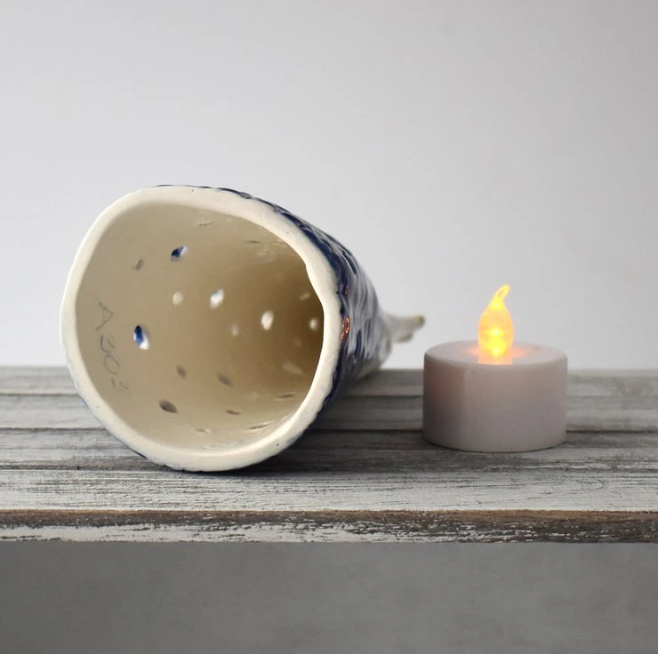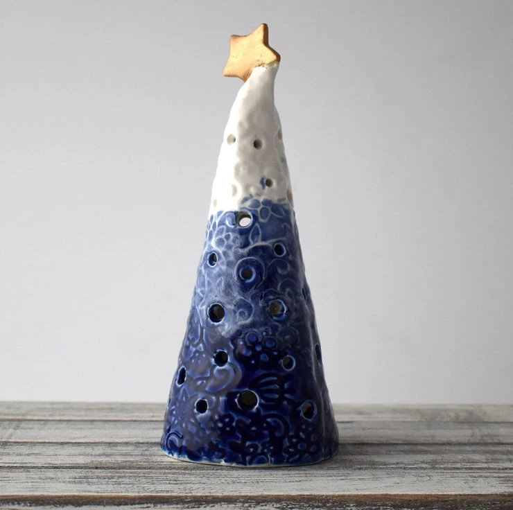 A cone shaped pottery Christmas tree with LED tea light included, standing around 17cm tall.