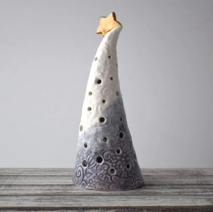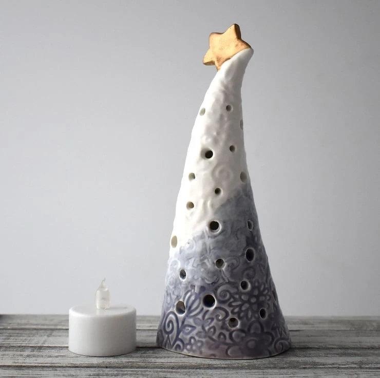 A cone shaped pottery Christmas tree with LED tea light included, standing around 18cm tall.