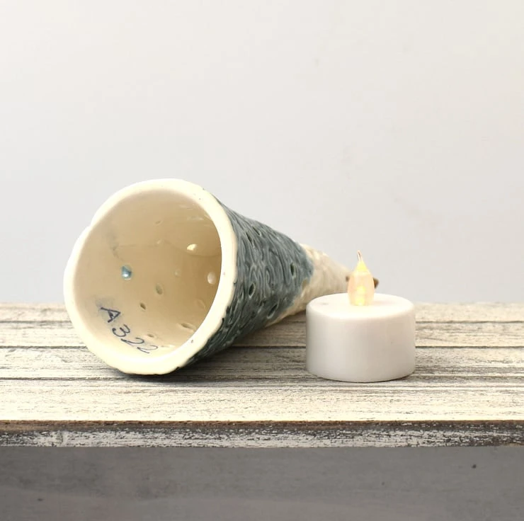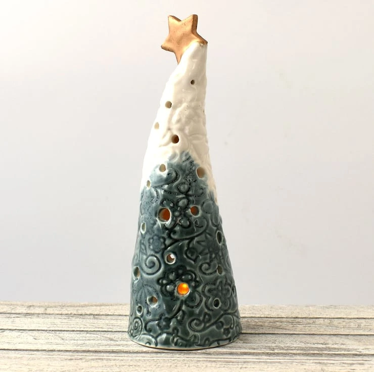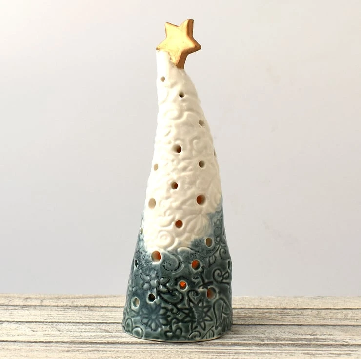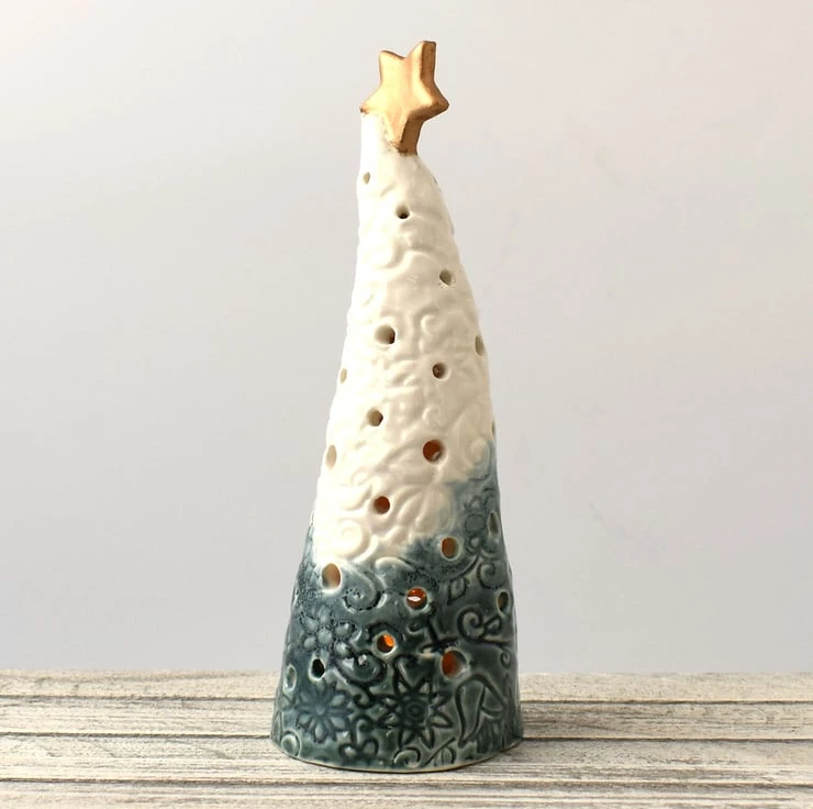 A cone shaped pottery Christmas tree with LED tea light included, standing around 17.5cm tall.