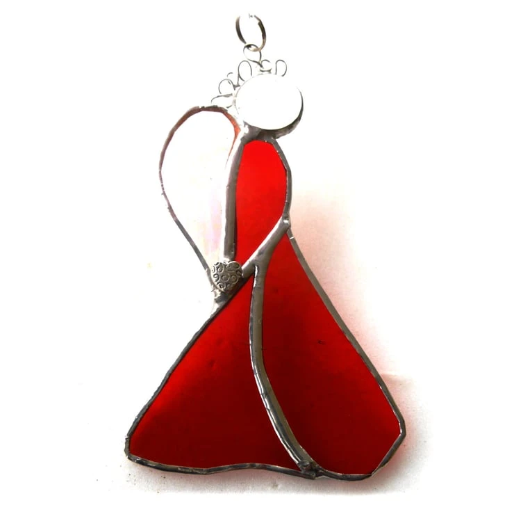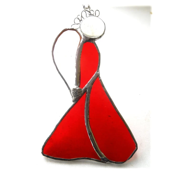 This is a stained glass suncatcher, an angel, made using the Tiffany copper foil technique.