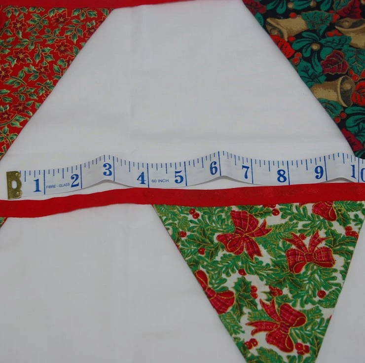 Each triangle has been hand sewn into a length of red cotton bias binding.