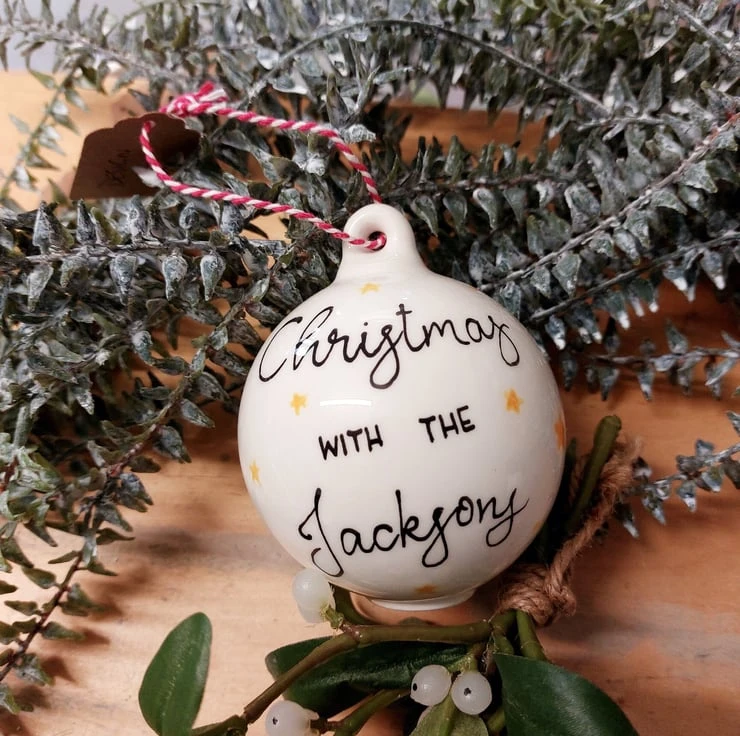 This is a personalised ceramic bauble, hand painted and lettered by hand — by me!