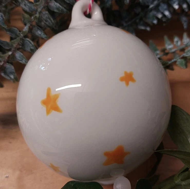 It is a white bauble, with black lettering, and hand painted yellow stars randomly dotted around the bauble.