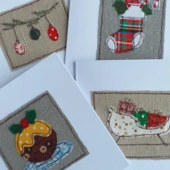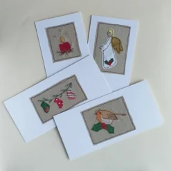 A set of four different Christmas cards, including a Christmas tree, a wreath, a stocking and a gingerbread house. All stitched onto linen in red and white thread using freehand machine embroidery.
