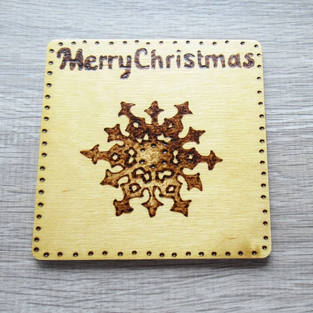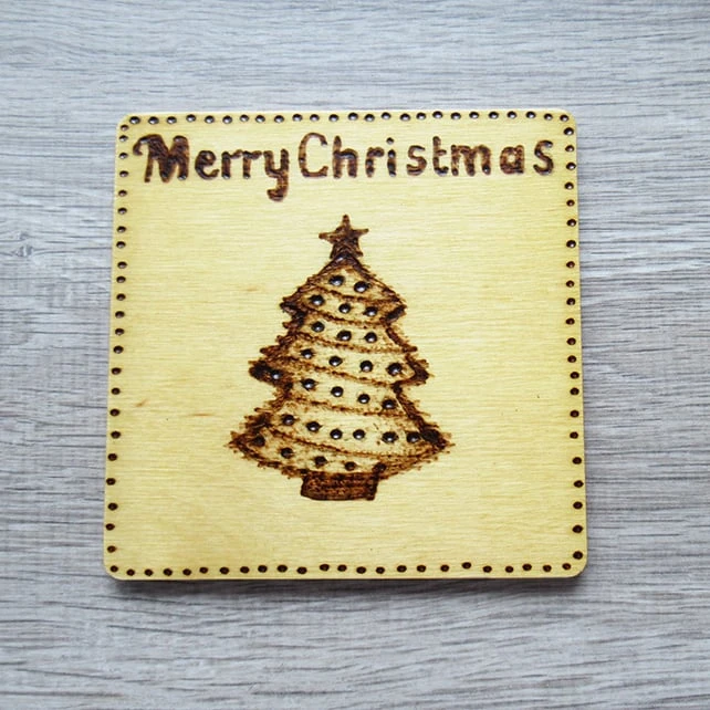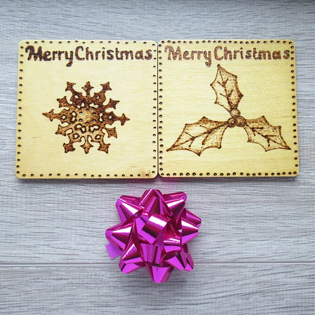 Functional and stylish, this set of four Christmas themed coasters features a separate design each, a Christmas tree, snowflake, holly sprig and mini snowflakes with the words ‘Merry Christmas’ along the top, all added to the coasters by pyrography.