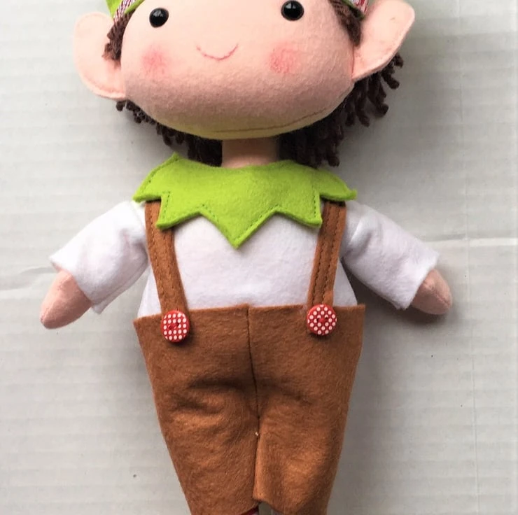 Made from a wool blend felt that is soft to touch, safety eyes and stuffed with polyester fibrefil. The girl elf has an outfit of red skirt with straps, trimmed with a stripey ribbon, white sweater with a green collar, elf boots (of course!) and a green hat finished with ribbon trim and jingly bell. The boy elf has short brown trousers.