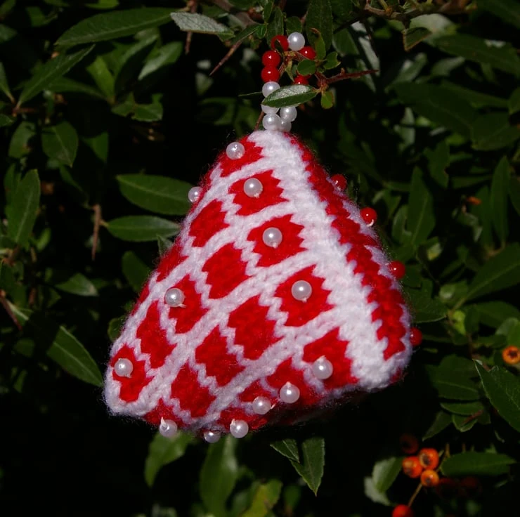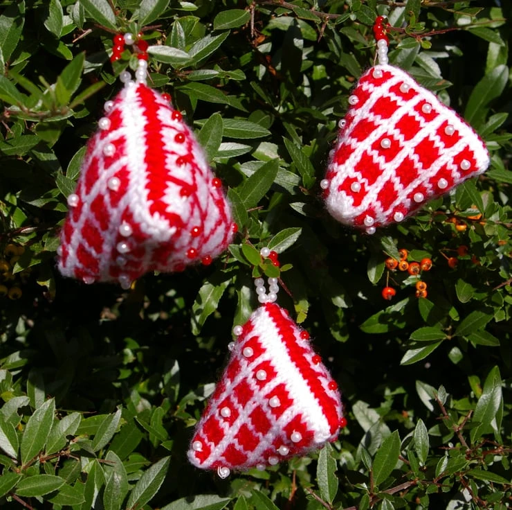 A trio of red and white hand knitted Christmas Decorations. These colourful decorations are called humbugs after those striped humbugs sweets of old. Each one is knitted in the Fair Isle tradition and hand sewn together. They are nicely decorated with white and red beads, each single bead has been individually hand sewn onto the Christmas Humbug. The little hanging loops comprising of red and white beads complete these decoration. They would grace anyone’s Christmas tree.
