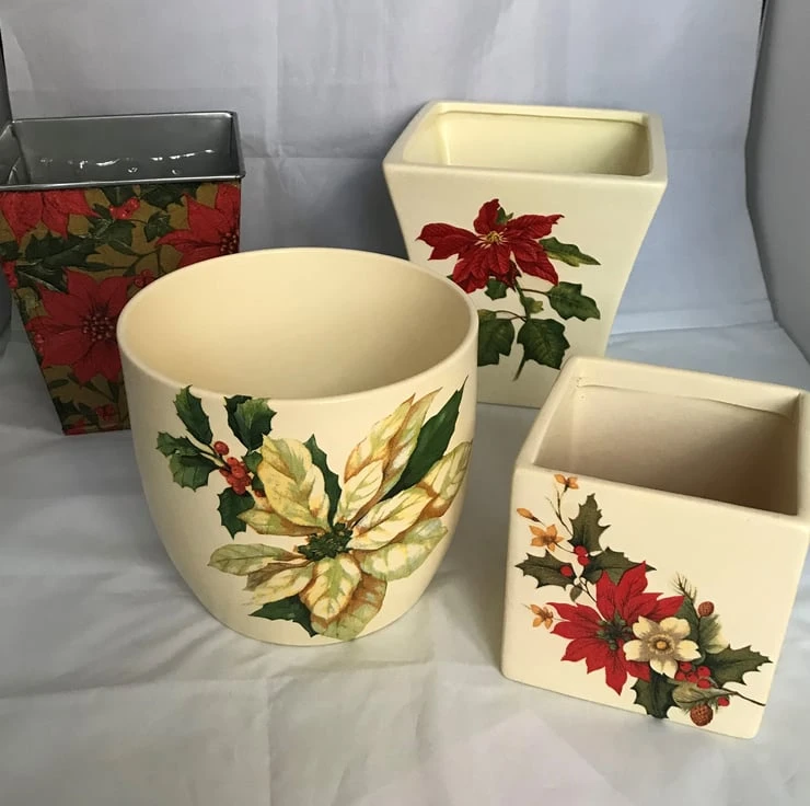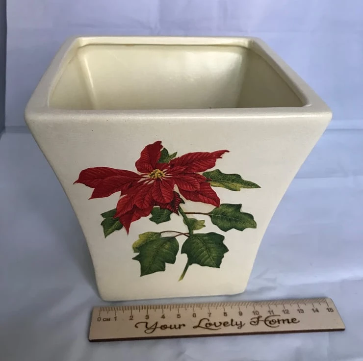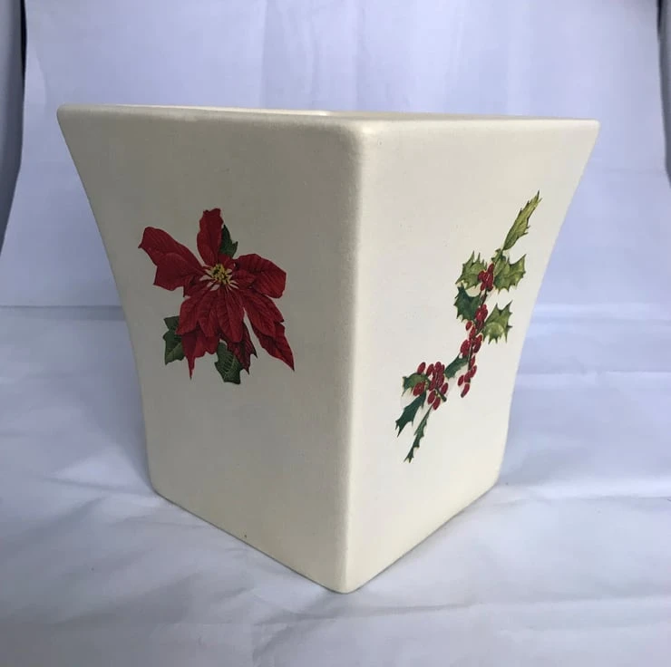 Each of the four sides of the pot has an image of either a poinsettia flower or of a holly and berries sprig.