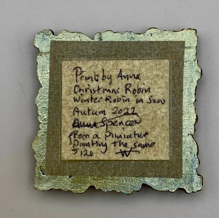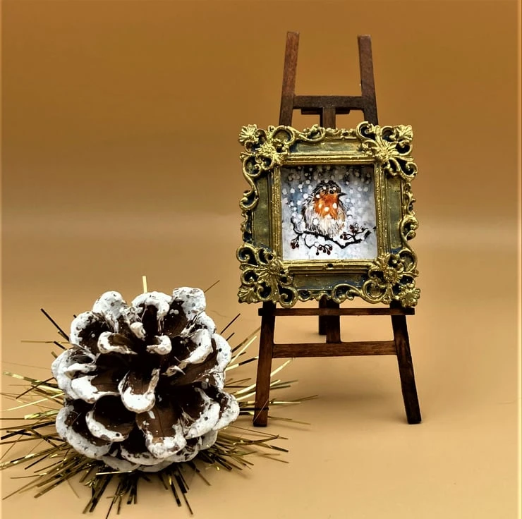 This is a tiny framed and signed PRINT of a Christmas Robin on a snowy branch. The whole picture is ‘dolls house’ scale (about the size of a large postage stamp). The print is taken from my original miniature painting of the same size, This little winter bird would make a charming gift or heritage Christmas decoration. Finishing by hand makes each little plaster frame very slightly different from another. I’ve added a touch of glitter to the gold acrylic frame to give it a little extra Christmas sparkle.