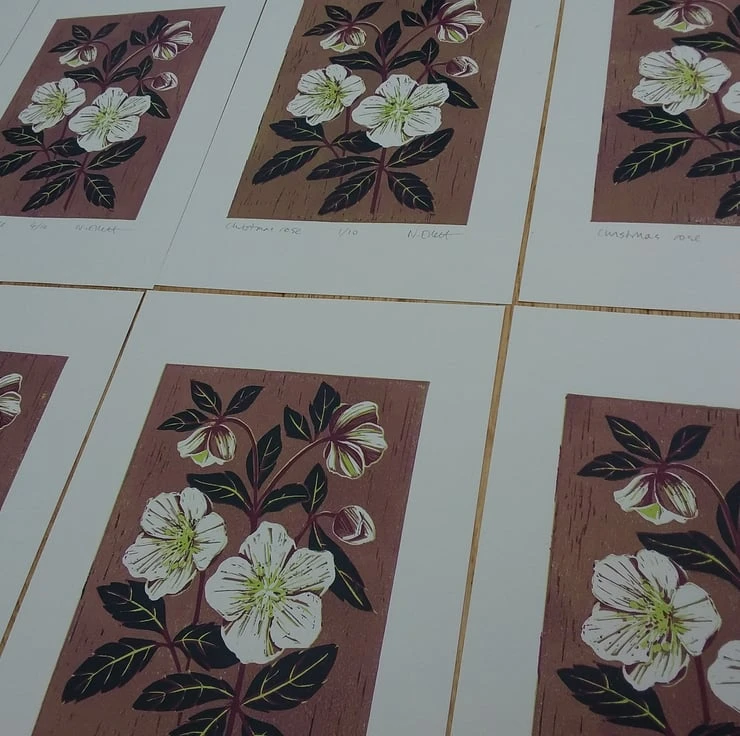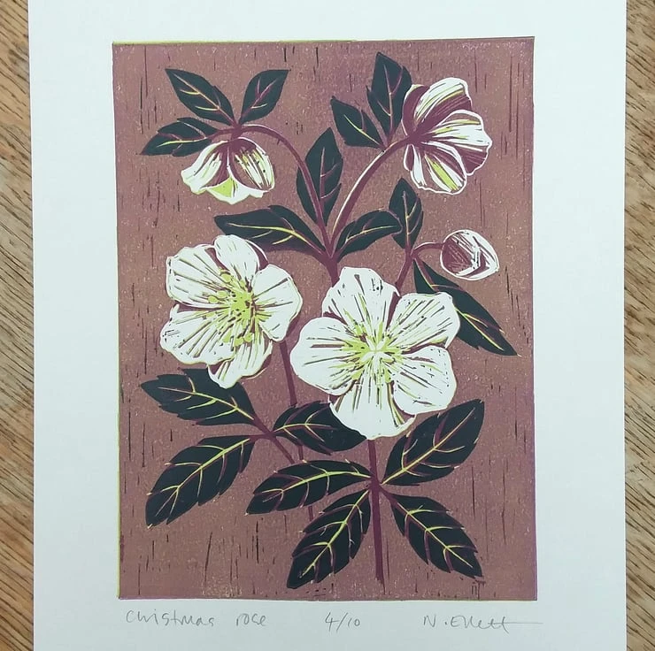 Christmas rose – a four colour reduction linoprint in rich mauve, pinks and green.