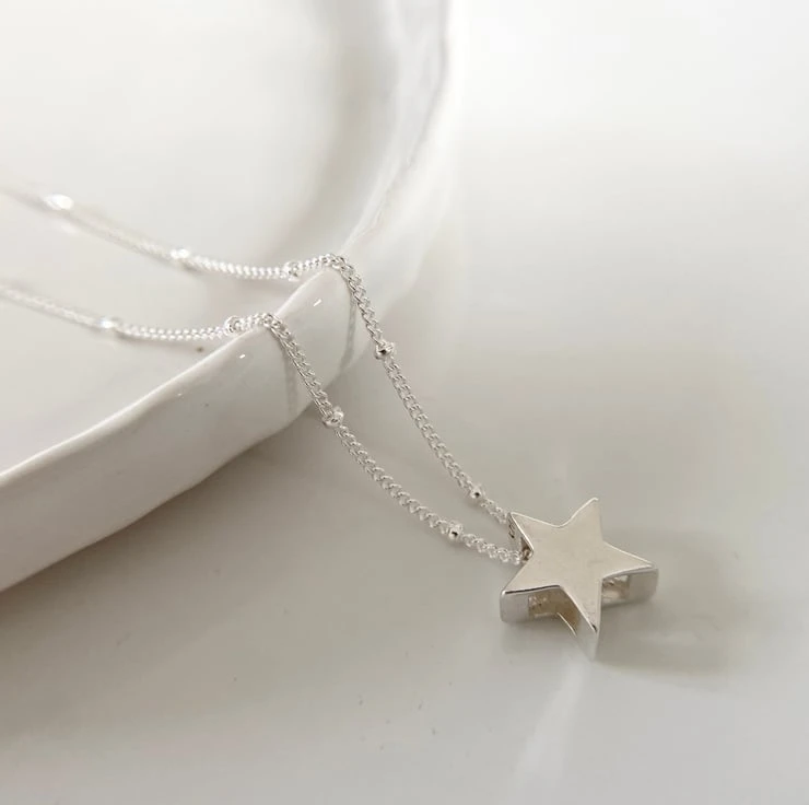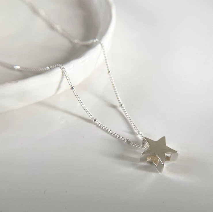 A tiny sterling silver star necklace. The 925 stamped star is petite measuring just 10mm and is threaded onto a delicate sterling silver satellite chain.