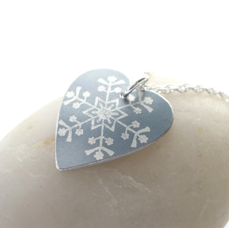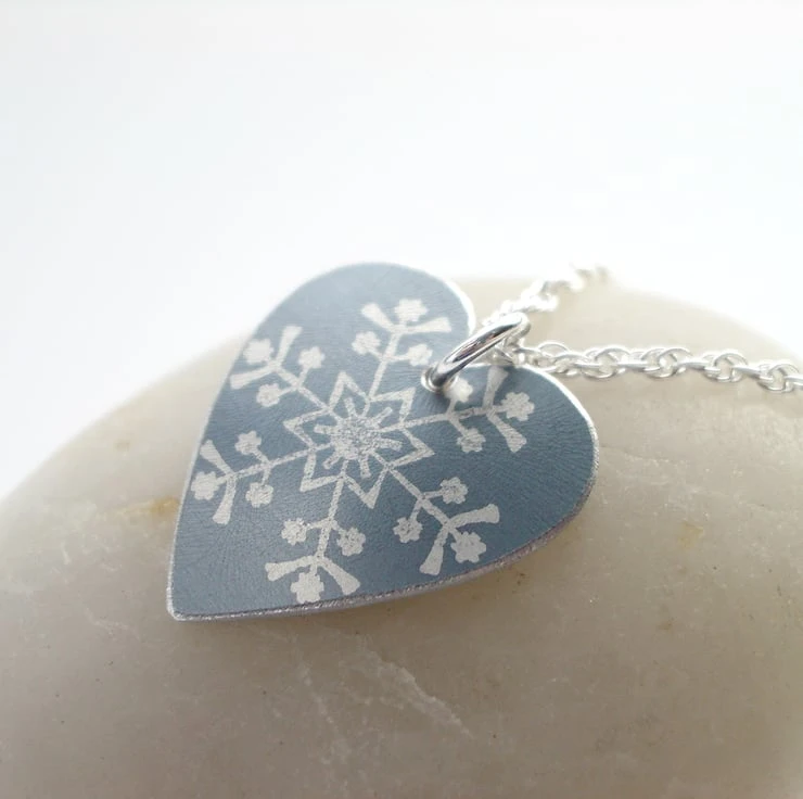 This silver grey coloured heart pendant is hand crafted from aluminium, which I have dyed, printed with a silver snowflake and sealed so that the dye becomes a permanent part of the metal. I have saw pierced by hand the heart shape and have then domed the heart so that it catches the light.