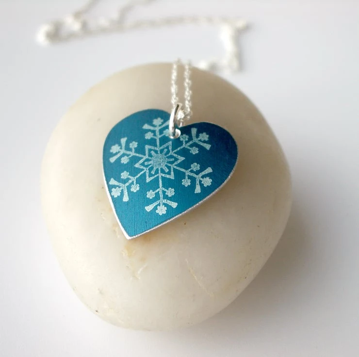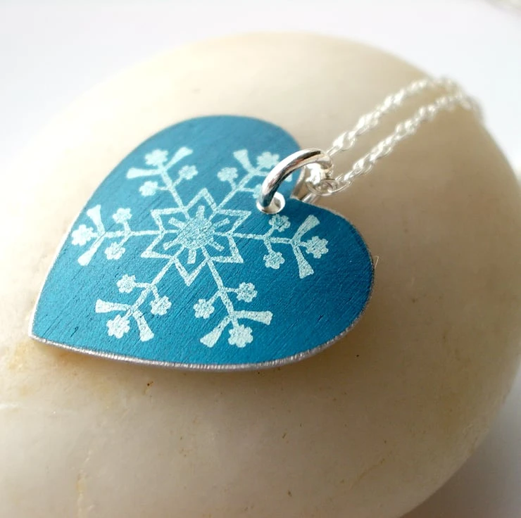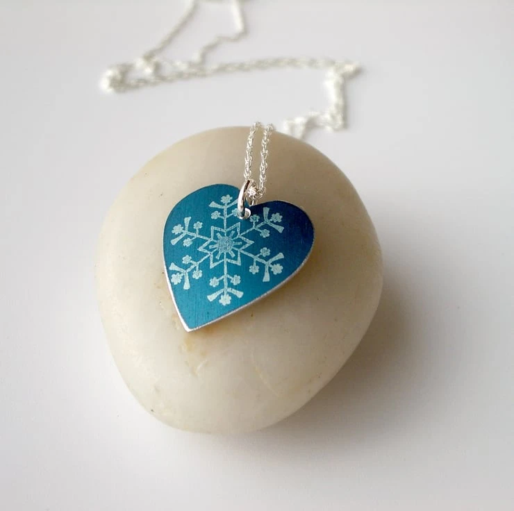 This teal blue coloured heart pendant is hand crafted from aluminium, which I have dyed, printed with a silver snowflake and sealed so that the dye becomes a permanent part of the metal. I have saw pierced by hand the heart shape and have then domed the heart so that it catches the light.