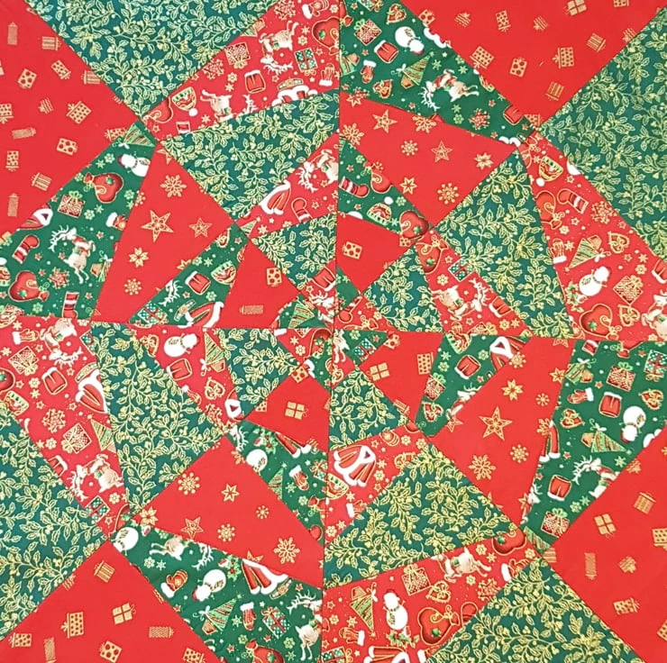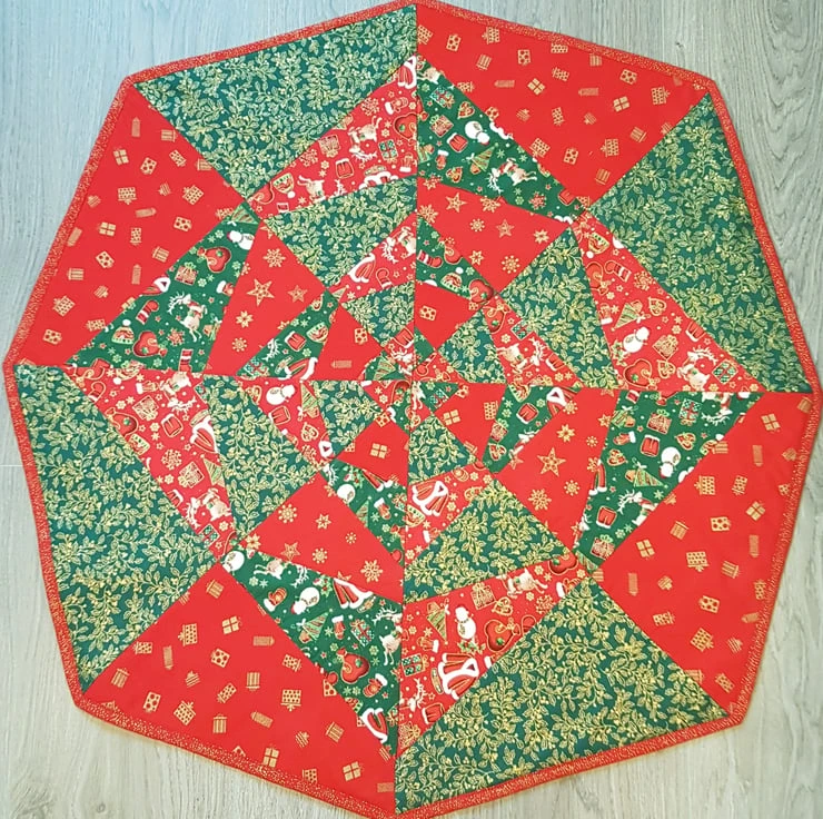 Octagon shaped patchwork table cloth.I recommend it for under the Christmas tree or center piece of the Christmas table or a smaller round table.Made from cotton fabrics in classic Christmas colors:red-green-gold.Size:diameter approximately 80cm.Made from a carefully selected fabrics with a very rich patchwork pattern.Ideal for Christmas gift.
