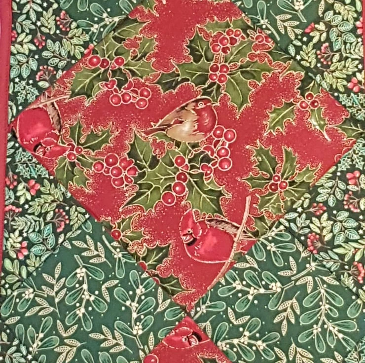 Beautiful handrafted patchwork Christmas table runner from stunning cardinal and robin birds patterned fabrics on burgundy red background. The patter are also contents berries and mistletoes on dark green with golden metallic details. Perfect for decorating the Christmas table or Christmas gift for someone. Dimensions: lenght 82cm, width:28cm