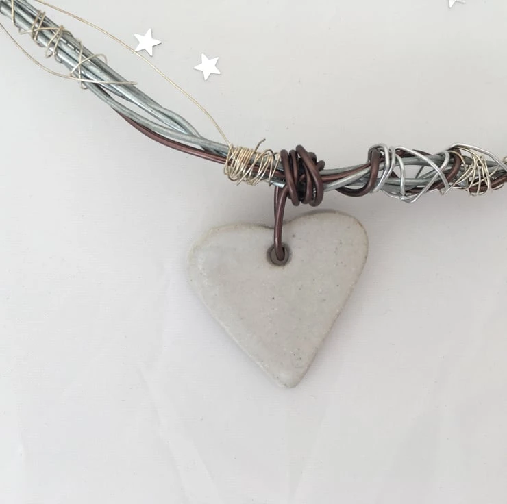 I have designed the wire art so that it can be hung directly from the wire in a number of positions. Ideally the snowflake should be around the top as the pottery is strung to sit in this direction.