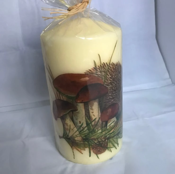 The image has been part ‘wrapped’ around the candle, and a small image of nuts, leaves and berries has been applied into the space between the two edges of the hedgehog image, so that there is something to see from all angles, e.g., if this candle is a centrepiece on the table.