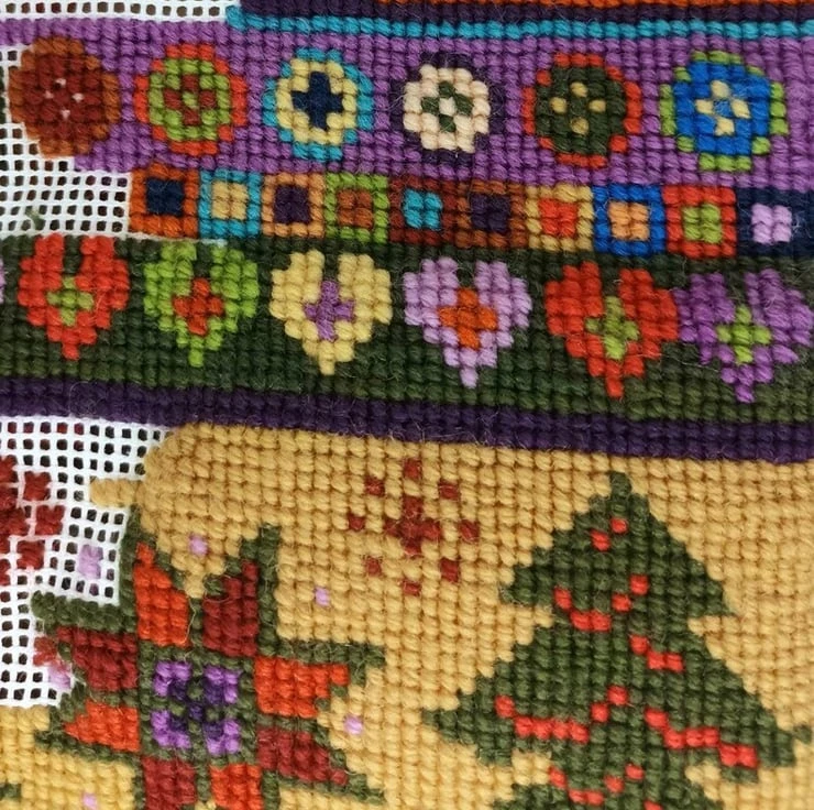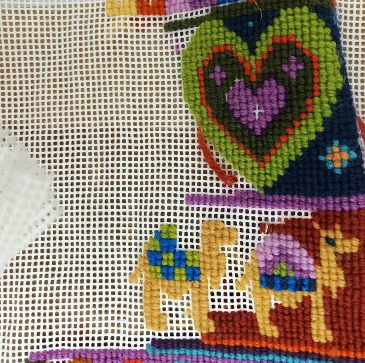 Elephants parade along the base, each a different vibrant combination of colours. Stitch stars, hearts, Christmas Trees and quirky colourful birds.