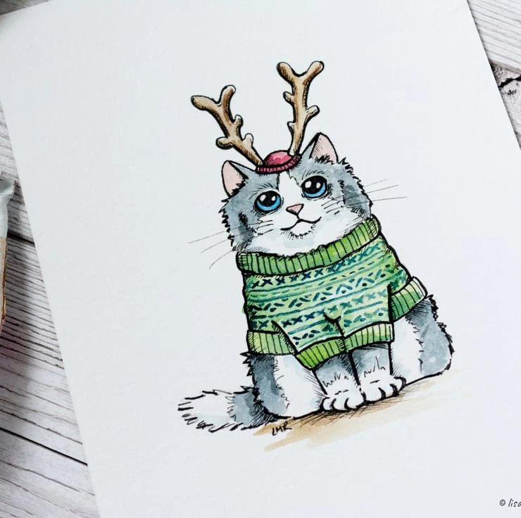 This seasonally cute kitty illustration was painted using watercolour & fineliner pen. It features a grey and white cat wearing a green patterned Christmas sweater and a reindeer antler hat.