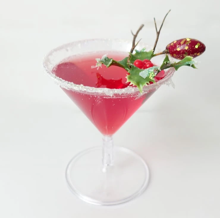 These delightful festive cake toppers consist of a mini martini cocktail plastic glass filled with cranberry resin, topped with fake holly, poinsettia, berries and sparkly leaves and twigs.