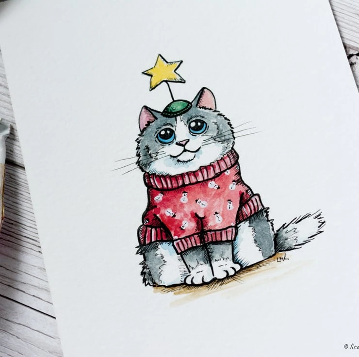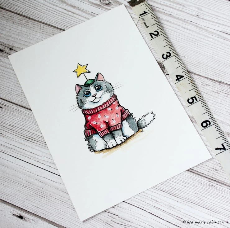 This super cute cat illustration was painted using watercolour & fineliner pen and features a grey and white cat wearing a red Christmas sweater and yellow star hat.