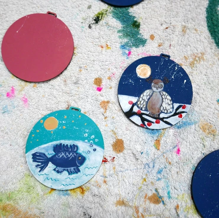 This turquoise Christmas bauble features a blue fish in the water and a wintry landscape at the surface with moon and snow (in art, everything is possible). The back is painted in plain turquoise. The bauble measures approx 3.20″ x 3.20″ (8.30cm x 8.30cm) and it can be hung on the wall all year round or it could make a perfect gift for someone who likes fish or housewarming gift for a nautical style home.