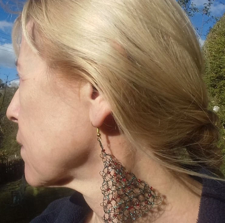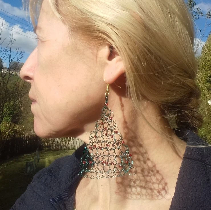 – Hand crocheted in lightweight 3mm green copper wire with red bead baubles.