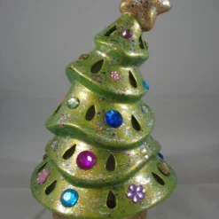 I have for sale a Christmas candle/tealight holder, which was hand painted by myself. It is a small green, glittery wonky Christmas tree, which has numerous small holes all over it, in between these it has been decorated with colourful gems. The tree stands on top of a gold glittery base, which is completely separate and holds the candle. Included in the sale is a free battery operated flickering tealight candle. This would make a lovely addition to anyone’s Christmas decorations, or perhaps given as a gift.