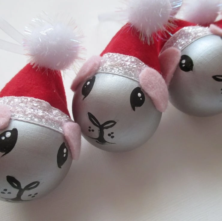 A set of five (5) hand painted wooden guinea pig head Christmas tree decorations. Each one of these piggie baubles has been hand painted, and wears a home made Santa hat.