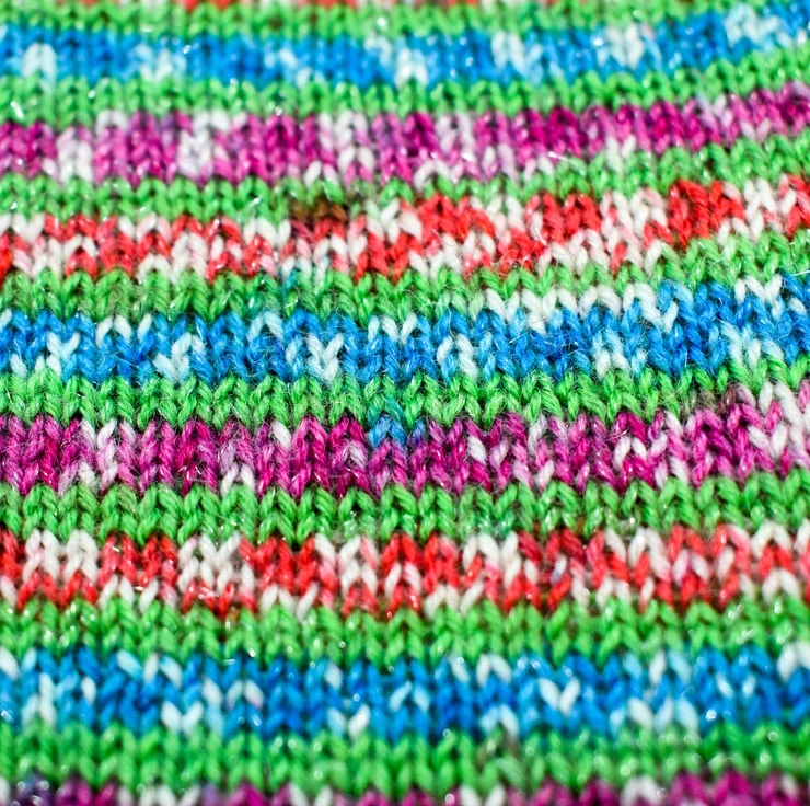 Hand knitted in 75% wool, 23% nylon and 2% polyester yarn, this cosy cover is has a striped design that also has sparkly thread running through the design.
