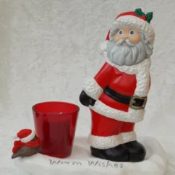 I have for sale a ceramic Christmas decoration, which was hand painted by myself. It is a white snowy base, with a small robin sitting on it and the words ‘Warm Wishes’, written in silver coloured lettering. Also, but separate, a Father Christmas ornament and a red glass candle holder, with a red candle inside. The Father Christmas is standing and looks like he is warming himself on the candle. This would make a lovely addition to anyone’s Christmas decorations, or perhaps given as a gift.