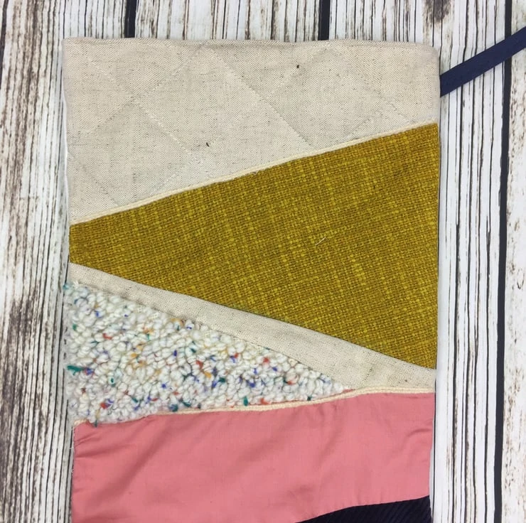 I’ve raided my treasured fabric stash to select special pieces for each section. One of the sections is punch hooked with a flecked wool to give a lovely soft textured area, another part is padded and quilted, other sections are built up with more fabric or pops of wool. The Navy section is corduroy and the hook is navy to coordinate the colourway. It’s backed with a sturdy white twill too.