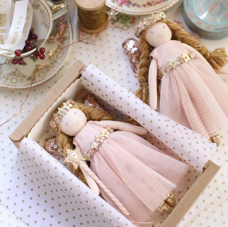 She is packaged in a little cardboard gift box filled with tissue paper.