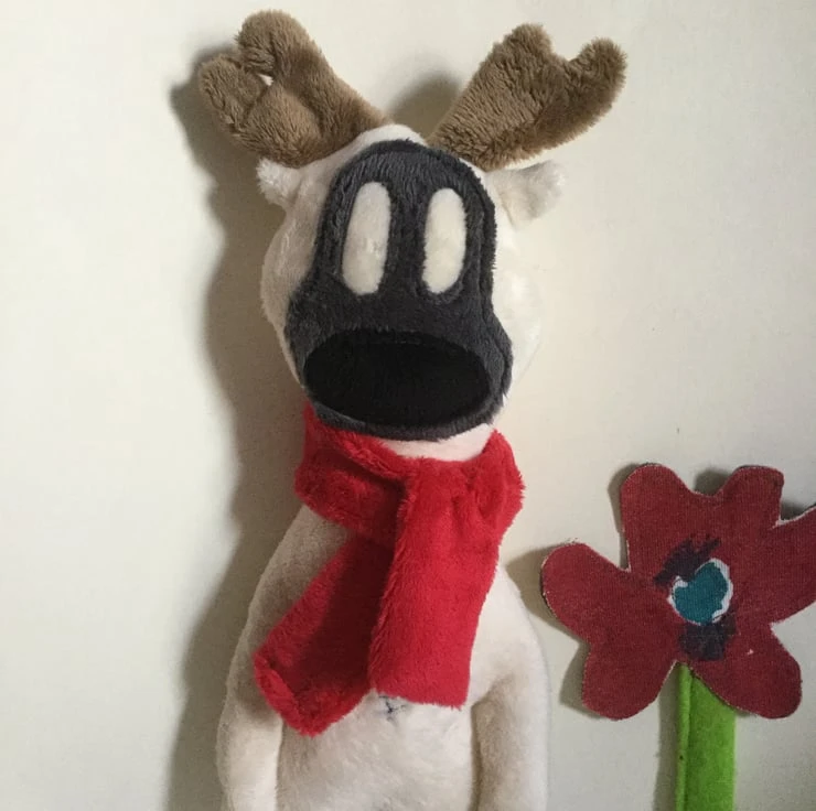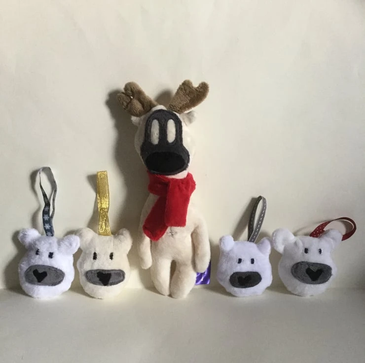 25cm from head to toe. Ivory plush body with grey plush face, black plush nose. Brown plush antlers with black embroidered eyes. A bright red plush scarf stitched around the reindeer’s neck.