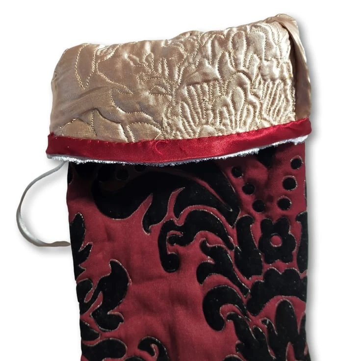 Luxurious, Victorian style, free machine quilted, Christmas stocking with soft satin gold coloured lining, 6cm wide lace trim at the top and hanging loops to hang from the mantlepiece or tree.