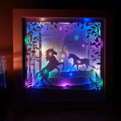 Lion themed shadow lightbox in 8″ frame. Complete with LED lighting supplied with batteries. The layers are made up of 310gsm cardstock, layered with mountboard, to provide a 3 dimensional effect. Everyone is handmade by myself to order, so there may be small variations from the listing image, but every effort is made to keep them all as similar as possible.