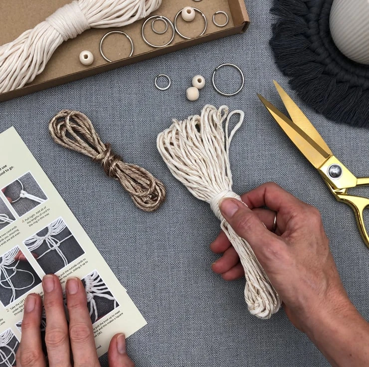 Inside the kit you will find 15 metres of single-twist recycled cotton cord in natural cream, 15 metres of natural cord with gold flecks, plus 1.5 metres of champagne metallic cord to add a bit of sparkle. There are eight metal rings in two sizes, four wooden beads and full step-by-step photographic instructions.