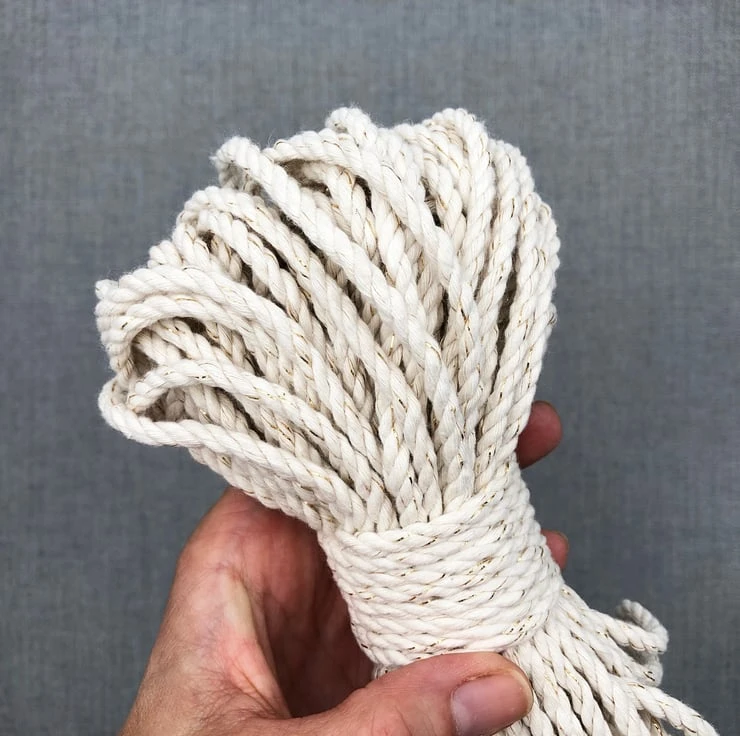 Inside the box you will find 19.5 metres of beautiful cotton rope in natural with gold flecks, a 6″ copper ring and full step-by-step photographic instructions.