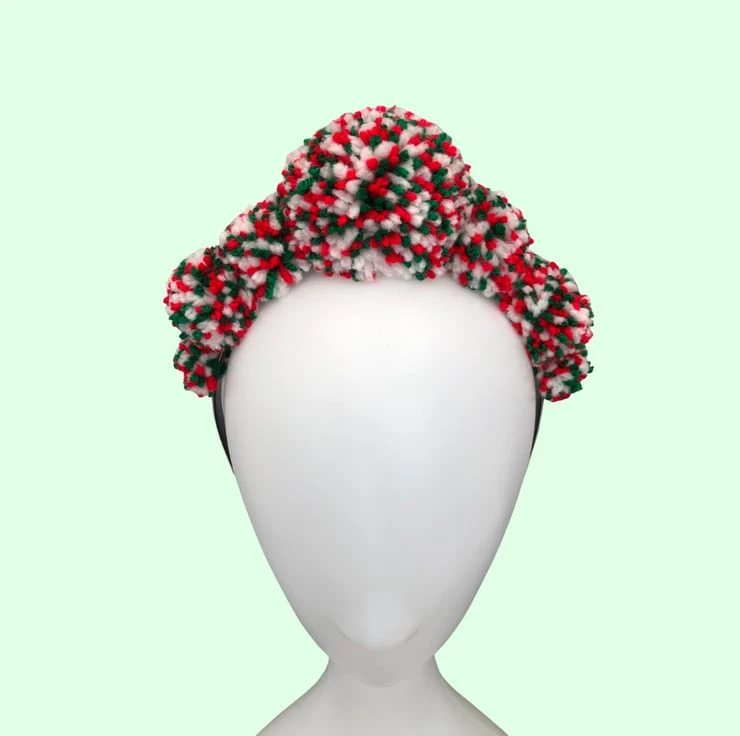 Introducing our party pom pom headband in green, red and white colours, a delightful party and festival accessory that effortlessly combines style and comfort. Each headpiece is a unique piece of wearable art.