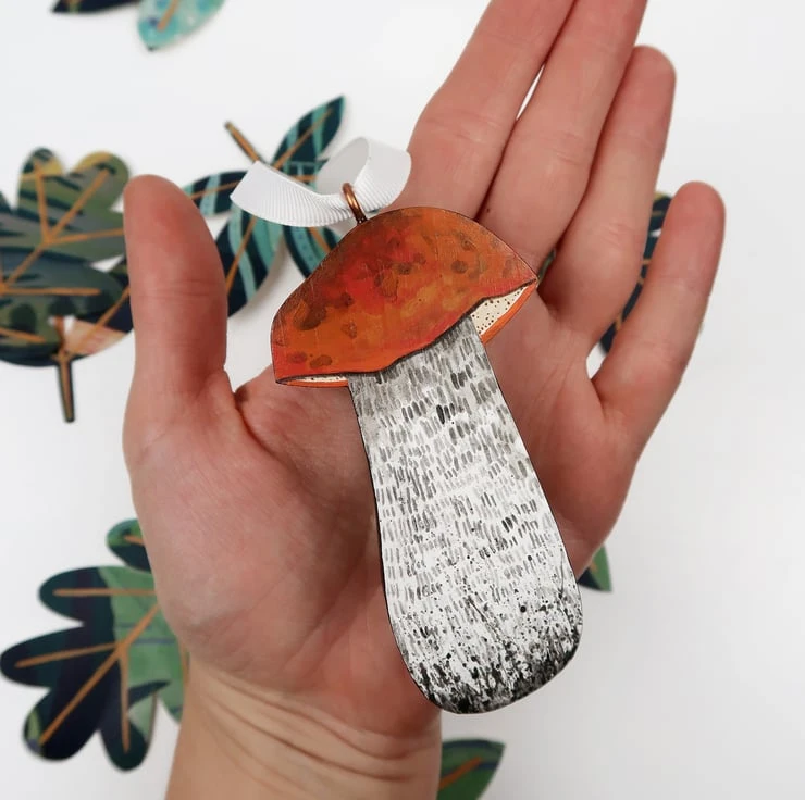 Beautiful wooden ORANGE BIRCH BOLETE Christmas tree hanging decoration.