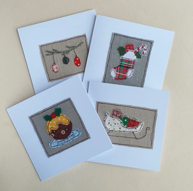 A set of 4 different Christmas cards containing one each of four designs: a Christmas pudding on a plate, a stocking filled with presents and candy canes, a pine branch with 3 hanging baubles and a sleigh full of presents. Each design is made with fabric appliqued onto linen using free motion embroidery.