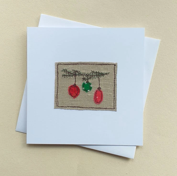 The cards measure 13.5cm by 13.5cm, come with a white envelope and in a cellophane bag for protection. Inside is left blank for your own message. The bauble and present fabric scraps will vary but will all be in greens and reds.