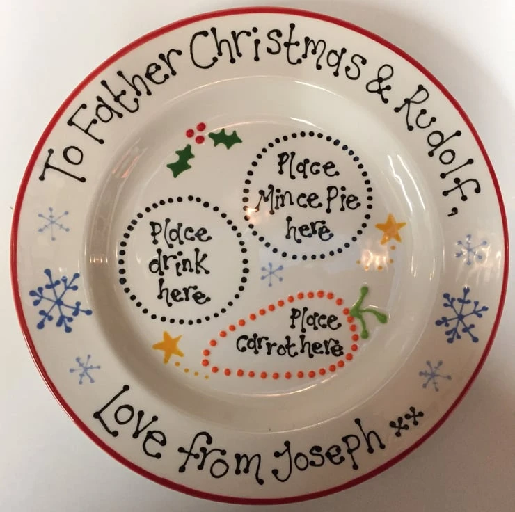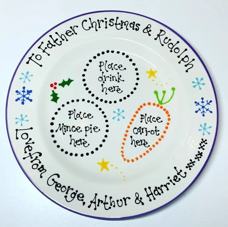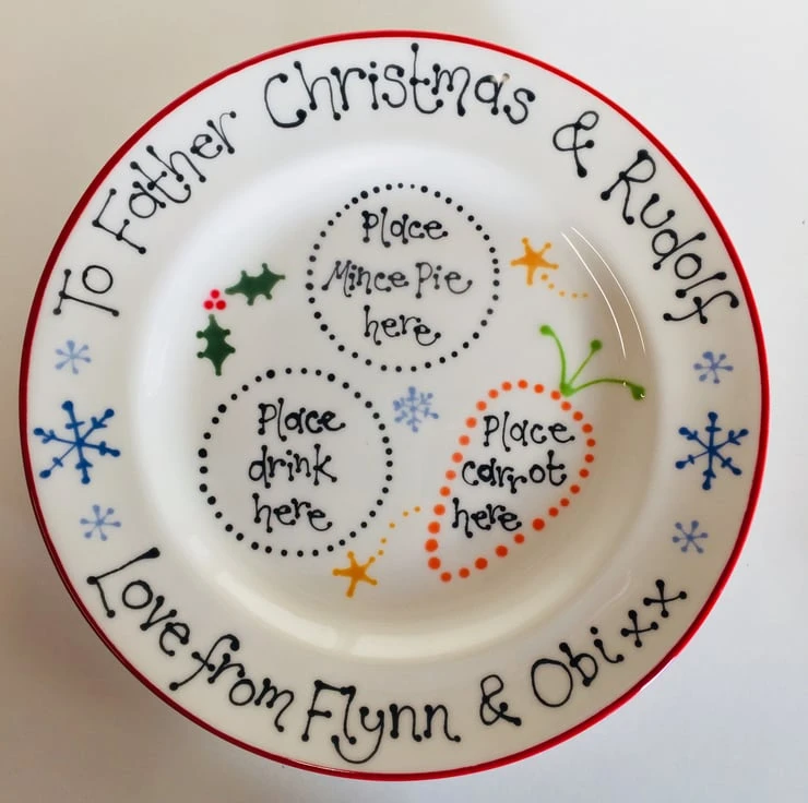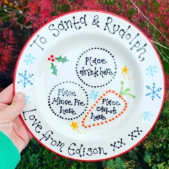This ceramic Christmas Eve Plate has been hand painted with a perfect space for Santa’s tipple and mince pie as well as Rudolf’s carrot. It can be personalised on request to include children’s names and is available with a red or blue rim. The plate has been glazed and kiln fired making it food and dishwasher safe. Not recommended for use in an oven or microwave.