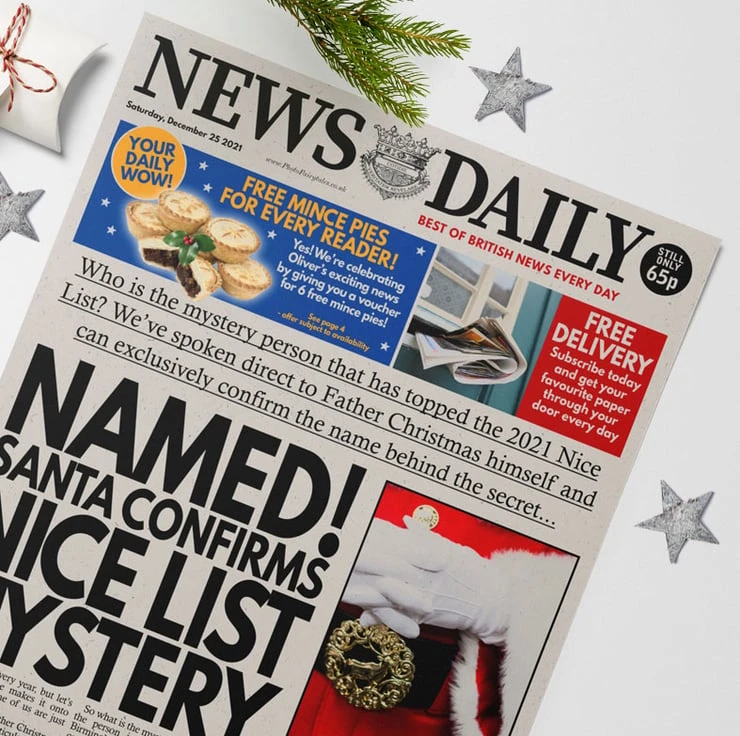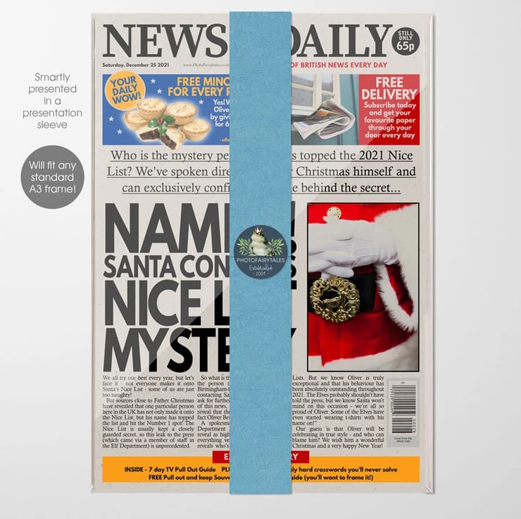Looking for a completely unique Christmas gift idea? This fun personalised newspaper print puts them right in the headlines this Christmas! Perfect for children or adults, they’ll love reading about themselves and discovering they’ve made it to the top of Santa’s Nice List this year. Personalised throughout, their details will be merged throughout the article and headline – you can even choose to add your own photo too. Printed on lovely off-white recycled paper and a generous A3 size, this gorgeous looking newspaper print makes a really different Christmas gift that will definitely make them smile!