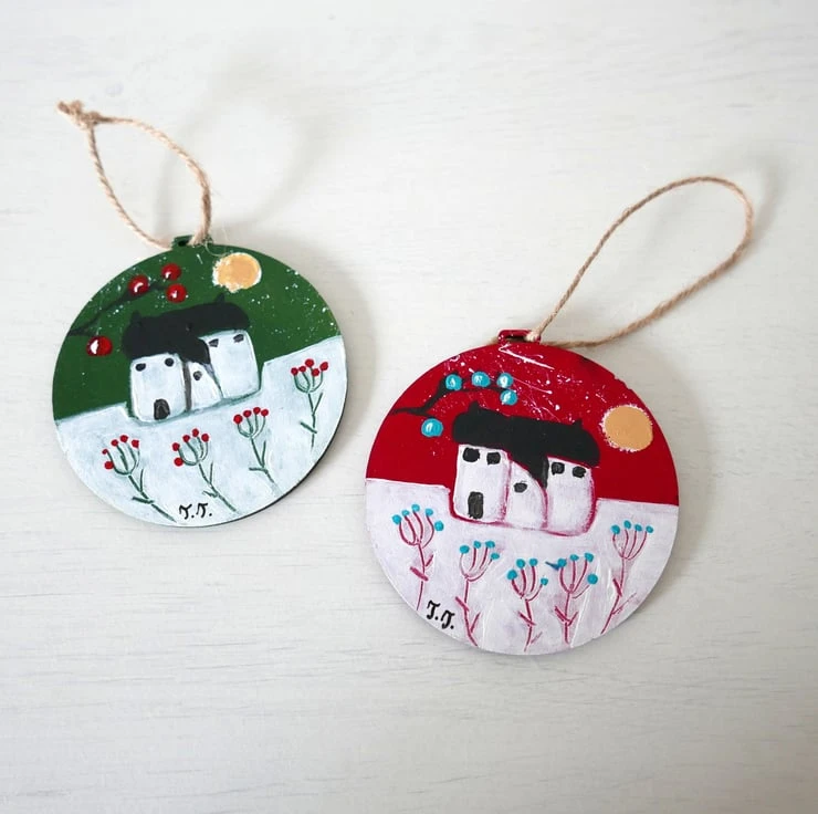 This red Christmas bauble is handpainted by me with acrylic paints on plywood and it features a Devon-inspired cottage against a red background with snow winter trees and turquoise berries. The back is also painted with a tree with yellow berries. The hanging decoration has a jute string for a rustic touch.