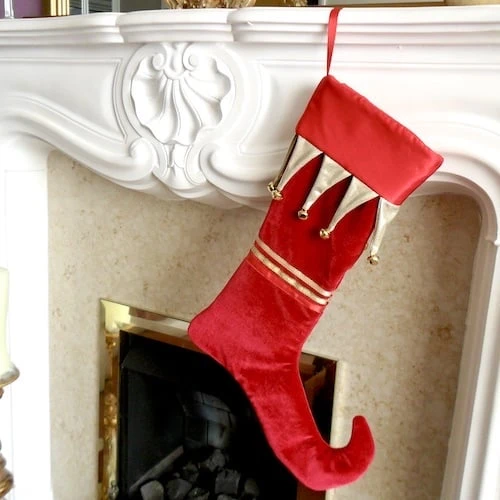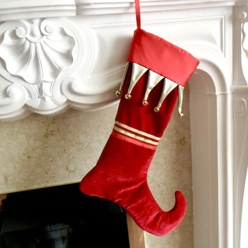 This gorgeous red velvet Christmas stocking has a red satin cuff trimmed with 8 gold foil effect pennants each with it’s own bell. It has a red ribbon hanging loop, ribbon trims and an ‘elf’ toe. The stocking is fully lined in red cotton and is lightly padded for a luxurious feel. Measuring 40 cm from cuff to heel, and 30 cm from heel to toe, this luxury stocking is designed primarily as a decoration ( PLEASE DO NOT HANG NEAR A NAKED FLAME OR OTHER HEAT SOURCE ), but is large enough to hold several small gifts.