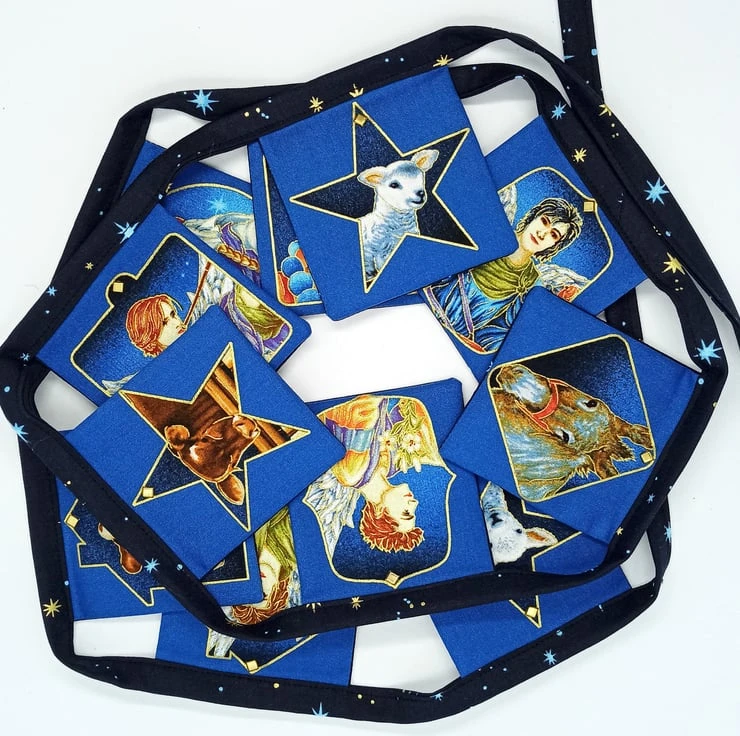 This bunting is 1.4m long with 30cm ties, and has 11 flags of the angels and manger animals.