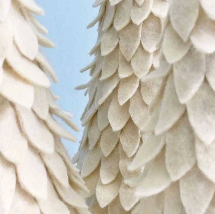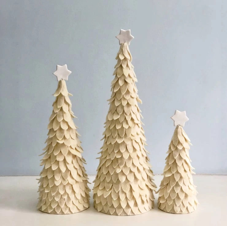 The leaves of these Christmas cone trees are a mix of wool and poly felt cloth. Each one is hand cut, then placed on a cardboard cone with hot glue. A clay star that I also made myself completes this Holiday display.